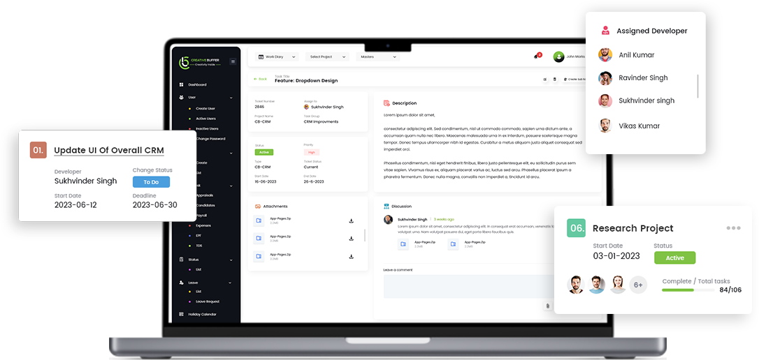The Super Admin defines access levels for each user role, enabling a secure and controlled environment. For example, HR might have access to payroll and attendance data, while Project Managers can manage tasks and projects.